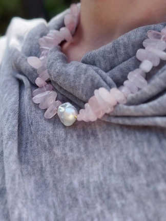 The Whispers of Rose Necklace is a delicate and graceful piece that exudes softness and tranquility. Featuring the soothing pink tones of rose quartz and the lustrous glow of a single baroque pearl, this necklace is a harmonious blend of nature’s finest elements, perfect for those who appreciate subtle elegance.